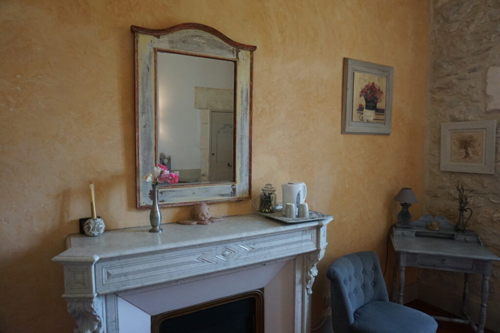 Elle se situe côté piscine et jardin, et rappelle le charme du passé avec ses enduits à la chaux. Une cheminée en marbre et ses tomettes, avec sa salle de bain avec douche à l’italienne dans la tour et toilettes privées. Un plateau de courtoisie est à disposition.